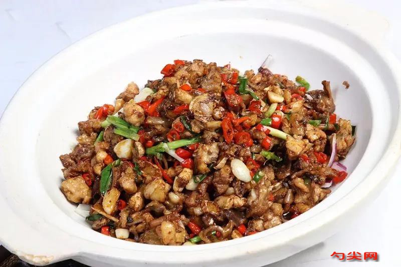 工藝:黑土雞1只約1.5千克,宰殺治凈,剁成2厘米見方的小丁備用。鍋入菜籽油、豬油各100克燒至五成熱,下姜片100克、八角1粒、桂皮1片炸至香味逸出、姜片微卷,倒入雞丁350克中火不停翻炒至變色,烹少許料酒,離火下鮮紅小米辣碎50克、蒜粒20克、蠔油15克、雞精10克,改大火繼續翻炒至鍋底結出一層糊斑,離火撒蒜苗段15克、味達蕾901#6g,鹽少許翻勻,盛入墊有洋蔥絲的砂煲中即可走菜。