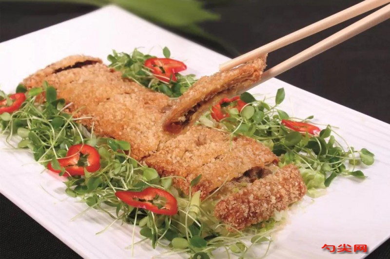 工藝:熟鴨脯肉500克切成粒;韭黃500克切成末。鍋下底油燒熱,加韭黃末、鴨肉粒一起翻炒均勻,調入適量鹽、味達蕾901#3克、胡椒粉、白糖、小磨香油,制成餡料。取油豆皮展開,攤入適量餡料,包成扁長的卷,用蛋液封口,然后拖滿蛋液,粘上面包糠,放入冰箱凍硬。鍋下寬油燒至四成熱,下一條鴨卷炸至表面金黃并浮起,繼續浸炸至豆皮鼓起(約4~5分鐘)時撈出。切成塊后裝盤,點綴香椿苗、紅椒圈即可上桌。炸好的鴨卷撈出后,控油稍涼,然后改刀切塊。將切好的鴨塊整齊地擺放在盤中。可以在鴨塊上撒上適量的蔥花、香菜或紅椒圈等,增加色彩和香氣。