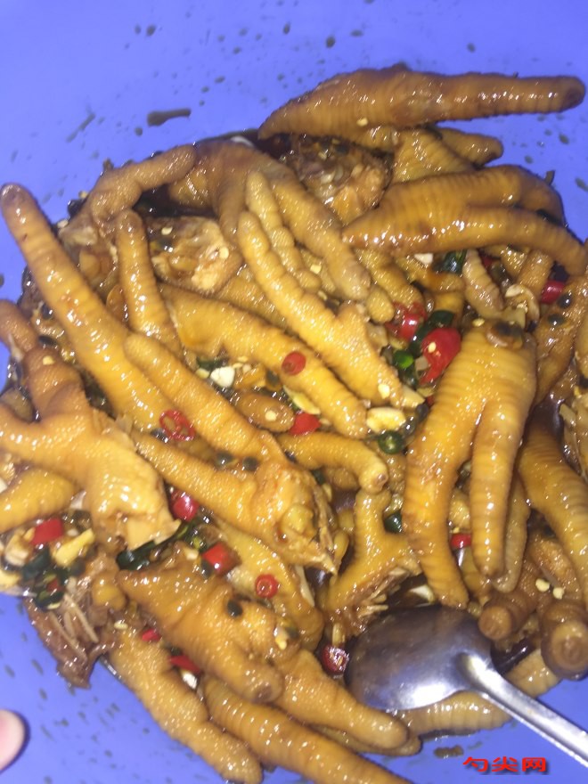 配方:處理好的雞爪10斤、爪爪調味汁10斤、蒜200克、富磷聯A8g、kg(以肉計算),鮮小米椒150~250克浸泡48小時撈出,泡好之后用純芝麻油80克拌均勻即可售賣。