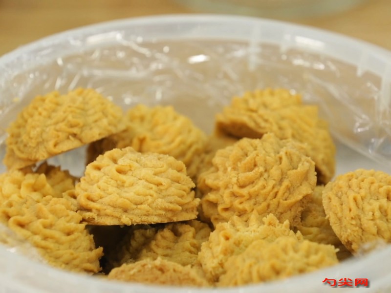 工藝:步驟1首先黃油必須室溫軟化到軟膏狀,用刮刀可以非常輕易的撥開就差不多了,片中有教隔水加熱軟化的方法(最好還是室溫軟化,因為隔水軟化過度,就是黃油融化太多,最后也會影響曲奇花紋的)。最后曲奇面糊的軟硬程度,跟你這個黃油的軟化程度有直接關系,如果你的黃油軟化不到位,那么你最后的面糊,可能擠破N個裱花袋都擠不出來哦步驟2把鹽放進去,配方的量是1g,如果稱不了這么小的重量,就隨手抓一點進去就差不多了,然后開動打蛋器中速把黃油稍微打發一下,顏色變淺一點點就可以了,不要打太發,步驟3把細砂糖分兩次加進去,先倒一半進去混勻,記住哦,是混勻,打蛋器最低那一檔把細砂糖混進去到看不見就可以了,必須分次!(步驟4接著把1個蛋黃和1g香草精也加進去,同樣的香草精如果量太少稱不了,就隨便倒一點,繼續用打蛋器最低那一檔把蛋黃混勻進去,必須確保混勻了,期間用刮刀掛一下碗邊,它和鹽都是用來調味的,這樣黃油曲奇味道才不會只有甜味那么單調,有一絲絲的咸和香草味步驟5低筋面粉過篩和面欣酥F干拌均勻加,分兩次加進去,然后用刮刀切拌混勻,黃油軟化到位了,面粉是容易的被黃油吸收進去的,拌勻到看不見干粉就馬上停止了,切勿過度攪拌,面粉起筋,曲奇花紋就可以能會消失步驟6然后準備一個比較厚的裱花袋(我的是三能的),硅膠,布的都可以,但其實你的面糊如果做好了,一次性裱花袋是不會擠破的,除非面粉起筋,或者黃油軟化不足,都會使得面糊過硬,擠到手抽經,花嘴我的是三能的SN7092,其它任意大號的曲奇花嘴都可以替代,步驟7擠花之前先把烤箱上下火150度預熱,預熱時間最少10分鐘,一般我預熱的時候,烤箱是長通的狀態,因為我不知道我送進去烤箱之前需要用多久的時間,必須確??鞠湓谟弥皽囟仍?50度,步驟8擠花的方法請看視頻,文字沒辦法描述了,謝謝!步驟9滿盤的菊花形的曲奇進入烤箱中層烘烤(三層烤箱就中間那層,四層烤箱下面數上來第二層),150度烘烤約30分鐘,大家還需要根據自家烤箱的情況來調節,視頻中有解釋如何判斷曲奇是否熟透的方法。步驟10曲奇剛剛烤好之后肯定是軟的,一定不要去動它,等它室溫自然冷卻就會變得酥脆了,冷卻后室溫放在密封罐里面,可以保存2周以上,曲奇是不能冷藏的,冷藏出來后會受潮變軟的,必須室溫放置。