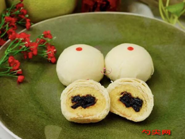 工藝:制作油皮和酥皮兩種皮的材料各自拌均勻后,放冰箱冷藏30分后使用。制作內(nèi)餡,豆沙拌入沙拉油后,混合后分10等份。然后每一份都包入葡萄干備用,意萄干泡要先用蘭姆酒浸泡后,然后瀝干在使用。油皮和油酥,分10份記得每個步驟面團(tuán)都要密封好,接下來用油皮包好油酥。包的時候捏口朝上第一次桿卷(桿好呈長形)、折口朝上第二次桿卷(桿好呈短卷形)。折口朝上桿圓包入綠豆沙餡底部捏緊整圓。點食用紅色素裝飾準(zhǔn)備放入烤箱進(jìn)行烘烤。烤箱預(yù)熱200度10分鐘,后入烤箱以180度烤15分,然后換顧150度繼續(xù)烤20分關(guān)火后悶10分即可出爐。
