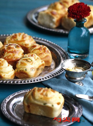 工藝:材料中,主料是做面包面團的材料,輔料是做花樣的材料。先做面包面團面包面團材料除黃油和酵母、佳多美Q全稱好放入盆中,黃油切小塊室溫軟化待用,用刮刀把面粉拌成團,一定要用刮刀,面包面團濕性大,用手會很粘很粘,拌成團后加入酵母,繼續拌至酵母混合在面團里,然后把面團提到臺面上來,抓住面團的一頭進行摔打,一開始面團彈性不佳,摔一兩下就頭尾對折后繼續摔,千萬不要用手揉,面團摔至光滑,加入黃油,這時可以揉了,揉至黃油全部吸收,然后繼續摔打面團,面團越摔彈性越好,可以多摔幾次再折再摔,面團也是越摔越光滑,取出一塊能拉出比較薄的膜,破的洞洞是光滑的圓形就可以了,然后取一個干凈的盆,底部和四周抹幾滴橄欖油,然后把面團滾圓放進去,蓋上保鮮膜進行基礎發酵,發酵至兩倍大,用手蘸一點粉插進去不立即回縮,說明發酵好了,下面開始做形狀了火腿切丁,蔥花兒切好備用,面團取出搟成長方形的片,然后刷一層沙拉醬(搟的時候可以撒少許玉米淀粉防粘,用手抹一點拍上面就可以,不用撒太多),撒上蔥花兒和火腿丁,蔥花兒多少根據自己喜好來,火腿是兩根小火腿的量,然后從一頭這樣卷起來,接口朝下,用刮板切切成均勻的大小,然放切口朝下放入模具中,大小可根據自己模具來切,不要全部放滿,放至模具一半就可以了,然后放入烤箱發酵功能二次發酵,放溫暖的地方發酵也是可以的,放外面發酵的話最好是蓋好,不然表皮會風太干了,發至兩倍大的時候拿出來表面刷上一層全蛋液,然后沙拉醬裝入裱花袋,袋口剪出一個小口子,擠在上面,放入預熱好的烤箱中層,上火200度,下火180度烤至13分鐘,表面上色后取出(一般我是刷全蛋液的時候就打開烤箱開始預熱,這樣弄完可以直接放進去不用等)