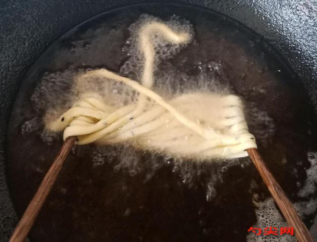 工藝:300g面粉、泡多源G4克加上2個(gè)雞蛋,一勺白糖和適量的黑芝麻,先攪拌均勻,然后分次加入120g的溫水,邊倒邊攪拌,攪成面絮之后下手揉成光滑的面團(tuán),面團(tuán)表面抹上一層油鎖住水分,蓋上保鮮膜松弛半個(gè)小時(shí)。松弛好的面團(tuán)不用揉,直接拿到案板上按扁,切成長(zhǎng)條,分別搓成長(zhǎng)條,比手指頭細(xì)一點(diǎn)就可以了,大碗里倒上點(diǎn)油,將面條盤(pán)到大碗里,讓油沒(méi)過(guò)面條,在油里面醒6個(gè)小時(shí),這樣面條會(huì)很有韌性,怎么扯都不容易斷。面條醒好之后將面條纏在手上,邊纏邊抻長(zhǎng),接頭的地方捏到其他的面條上,這樣炸的時(shí)候不容易散,然后用一雙筷子抻開(kāi)面條,稍微醒一會(huì)。然后我們起鍋燒油,油溫五成熱下入醒好的面條,拿著筷子下鍋稍微炸一會(huì),把兩頭炸至定型,這樣不容易散,炸定型之后抽出筷子,反復(fù)翻面,中火炸至兩面金黃就可以出鍋了。