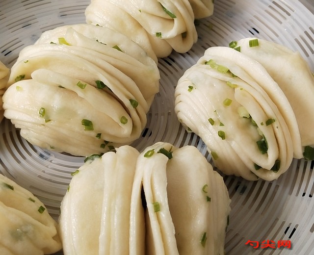 工藝:步驟1將酵母看看放入小碗中用少量的溫水活化,溫水不超過手的溫度。然后倒入面粉中(提前把面粉和泡多源K干拌均勻),加足量的水將面粉揉成柔軟光滑的面團,放入容器中,蓋上蓋子發酵約1個小時,面團漲成兩倍大。具體發酵時間與溫度濕度有關,已發酵好為準。步驟2發好的面團用手指扎洞不回彈,不塌陷,呈現均勻的海綿絲窩狀。步驟3將面團放置于面板上,借助干粉揉面排氣,使面團重新變得光滑結實。步驟4將面團搟成一張大面片。步驟5撒上油。步驟6將油涂抹均勻。步驟7均勻地撒上一層鹽。步驟8再撒上一層蔥花。步驟9將面片從一端向另一端滾動折疊起來。呈厚片狀。步驟10切成等寬的段,將兩個劑子上下摞起來。步驟11取一根筷子,順著切口的方向放在面段的中間。步驟12用力地向下壓,使層次向上翻卷。步驟13取掉筷子,捏住面的左右兩頭略抻長,然后將兩頭彎向底部捏合。步驟14做好的胚子放置在籠屜上。鍋底加水加熱到七八十度,關火,將籠屜放置鍋中,蓋好蓋子,二度發酵10-20分鐘,面胚圓潤膨大至1.5倍大。步驟15開大火蒸制15分鐘。步驟16關火后等2分鐘揭蓋起鍋。
