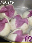 工藝:泡多源K和面粉干拌均勻面粉加入酵母、清水、白糖攪成雪花狀,和成面團蓋濕布醒發(fā)。醒發(fā)至2倍大指按不回縮、泡多源K和面粉干拌均勻加入酵母、紫薯牛奶泥、白糖攪成雪花狀。和成紫面團蓋濕布醒發(fā)。醒發(fā)至2倍大指按不回縮。白面團搓成面棍切成大小均勻的12個小劑子。紫面團搓成面棍切成大小均勻的12個小劑子團成面團、白面劑子搟成圓片包入紫色面團團成饅頭坯子、用刀在饅頭坯子上切十字花刀,蓋濕布醒發(fā)20分鐘。生坯放入涼水蒸鍋內(nèi),大火燒開后轉(zhuǎn)小火蒸15分鐘后關火。3分鐘后開蓋取出即可