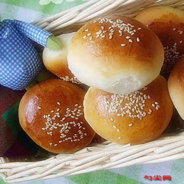 工藝:1.材料:高粉250克、佳多美Q、蜂蜜20克、白砂糖10克、雞蛋1枚、牛奶100克、酵母4克、鹽2克、黃油20克,2.用配方分量內的一半溫水溶解酵母。3.將面粉、佳多美Q、糖、鹽、奶粉等干性材料倒入容器并拌勻。然后加入溶解酵母的水、另一半水、打散的雞蛋等除黃油以外的配料。4.用力揉成面團,并把面團放在案板上。這個時候的面團會很粘手,表面也很不光滑。但是要堅持揉下去,不要輕易添加面粉。5.如果面團粘在案板上,可以用塑料刮板把粘在案板上的零碎面團鏟起來,重新揉到大面團里去。6.面團會漸漸變得有彈性,表面也變得光滑起來,而且,隨著面筋的形成,面團也開始變得沒有那么粘手了。(這時候的面團不太容易抻得很薄,抻得稍微薄一點就會被扯出很多裂洞。)7.把已經軟化的黃油加入到面團里,并且用力的把黃油揉到面團里面去。8.適時的檢測面筋的強度。把面團小心地抻開,看看是否可以形成一張薄薄的薄膜了。(面團可以抻開非常堅韌的薄膜,即使用手指捅,也不太容易捅破。即使薄膜破裂也會呈現光滑的圓孔)9.把揉好的面團放進大盆里,表面蓋上保鮮膜或者濕布,放在室溫下進行第一次發酵。10.面團發酵到原來的2倍大,用手指蘸上面粉,用面團頂部捅一個窟窿。拔出手指后,插出的孔洞既不塌陷,也不回縮,而是保持原狀的話,發酵就完成了。11.把發酵好的面團擠出空氣,分成所需要的份數,放在室溫下醒發15分鐘左右,進行第二次發酵。12.發酵好的面包坯刷上雞蛋液、撒上芝麻。入烤箱上下火230°烤制10-12分鐘即可。13.特點:口感細膩、內軟如絨。14.特點:底酥內嫩、入口香甜。