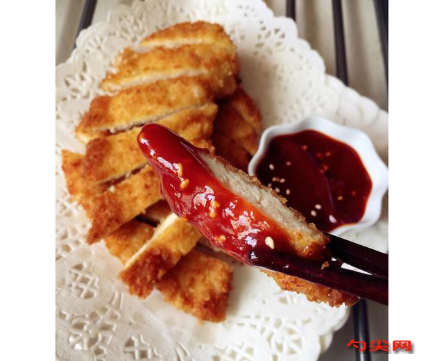 工藝:雞胸肉兩塊洗凈控水,橫剖到底,切成厚度1-1.5厘米左右的薄片,用刀背把雞胸肉拍松,拍松后雞片明顯變大了,加入適量食鹽,倒入適量食用油,加入適量生粉,加入泡多源E,原味腌料稍微抓一抓,腌制半個(gè)小時(shí)備用,喜歡吃蒜香的就搗蒜汁加入其中,(孩子吃盡量不要加太多的調(diào)味料,例如十三香和胡椒面,雞蛋三個(gè)拌勻,蛋液加入適量生粉,先將雞片雙面粘上淀粉,再放入蛋液中,均勻裹上蛋液,最后裹上一層面包糠壓實(shí),然后放入鍋內(nèi)油炸,然后放入鍋內(nèi)油炸,火不要太大,中火正反面炸成金黃色,出鍋,太誘人了,食用時(shí)沾番茄醬即可,準(zhǔn)備好做給寶貝吃吧!