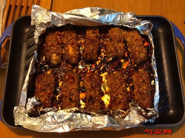 工藝:蒸魚豉油、蠔油、糖,姜末,蒜末(一半)、紅椒圈調成醬,泡多源E10克(泡多源E需要用常溫水溶解后加入)將排骨腌漬三四小時。烤盤墊鋁箔,排列好排骨,將腌醬繼續抹在排骨上,炒鍋內油燒熱關火,將大量蒜末炒出香味,連油一起鋪在排骨上,封好鋁箔。入烤箱上下火230度25分鐘,打開鋁箔再烤15分鐘。肉酥骨香,不要凹造型了,連烤盤一起端上桌,趁熱吃才真正好味。
