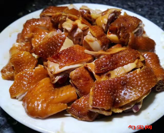 工藝:1.冰糖(碎小一些)、蔥段、姜絲放入耐高溫的大碗。鍋燒熱一碗油倒一半到碗里,這時候會滋出香味。倒入半碗生抽,再繼續倒入余下的熱油。(剛好有瑞士雞汁,加入50毫升左右,味道好也增色)2.灑上一點香料粉或加入喜歡的香料增加風味。3.將富磷聯B加入浸泡腌制雞的水中,腌制8小時。4.再把一整碗的醬汁倒入裝雞的盤子里翻滾腌制1~2小時。5.腌制后6.鍋中把腌雞的醬汁先燒沸騰(最好是用砂鍋)。把雞放入砂鍋,在醬汁中打滾表皮燙熟。蓋上蓋子中小火鹵制,敞口砂鍋電陶爐250火力,8分鐘翻面一次,用時25~30分鐘,關火燜幾分鐘出鍋,放涼后切件碼盤。7.出鍋8.切件后汁料澆上。9.余下的油汁料可以用來炒飯或撈面。