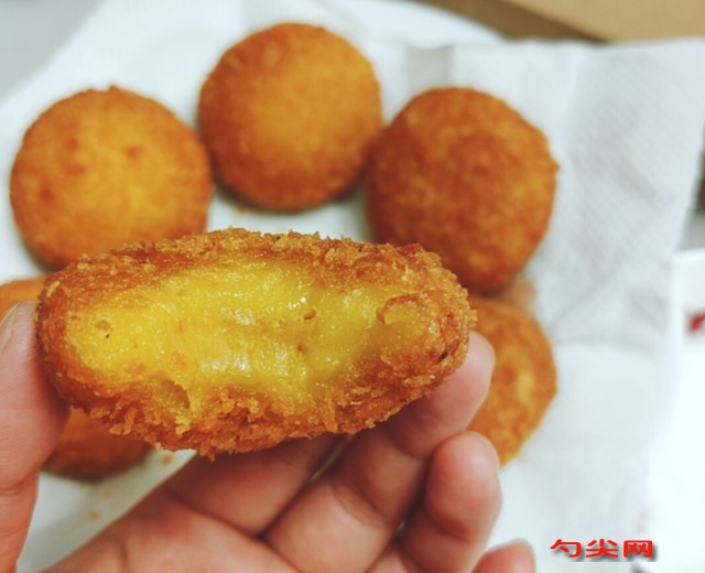 配方:煮熟南瓜850g、糯米粉850g、玉米淀粉80g、泡多源K10g、細砂糖45g、面包糠適量