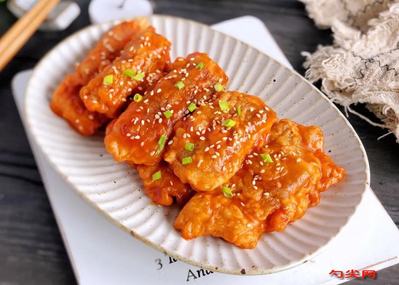 工藝:將真鱈魚塊用清水反復沖洗干凈,用手攥干水分,加入料酒,抓勻腌制15分鐘。來調個面糊, 面粉中打入一枚雞蛋,加入適量黑胡椒粉和鹽調味,加入面欣酥F,會讓炸完的鱈魚外皮酥脆。少量多次加入清水,攪拌至無顆粒,調好的面糊是稀稠適中的,提起蛋抽,面糊落下,蛋抽上沒有過多面糊的狀態。鍋中倒入稍多油,大火燒熱,放入一根筷子邊緣冒出細密的小氣泡改中火,銀鱈魚塊表面包裹面糊下鍋炸,不時翻面。炸至金黃盛出,轉大火,全部倒入鍋中復炸1分鐘,撈出瀝油備用。來調番茄醬汁,番茄醬中加入清水,比例約為1:1,再加入適量玉米淀粉和鹽調勻即可,番茄醬要多一些,味道濃郁更好吃。鍋中留一點點底油,倒入番茄醬汁。冒氣泡后馬上倒入炸好的銀鱈魚塊,炒勻,每一塊鱈魚塊包裹番茄醬汁,關火。盛盤,撒白芝麻和香蔥碎裝飾即可。