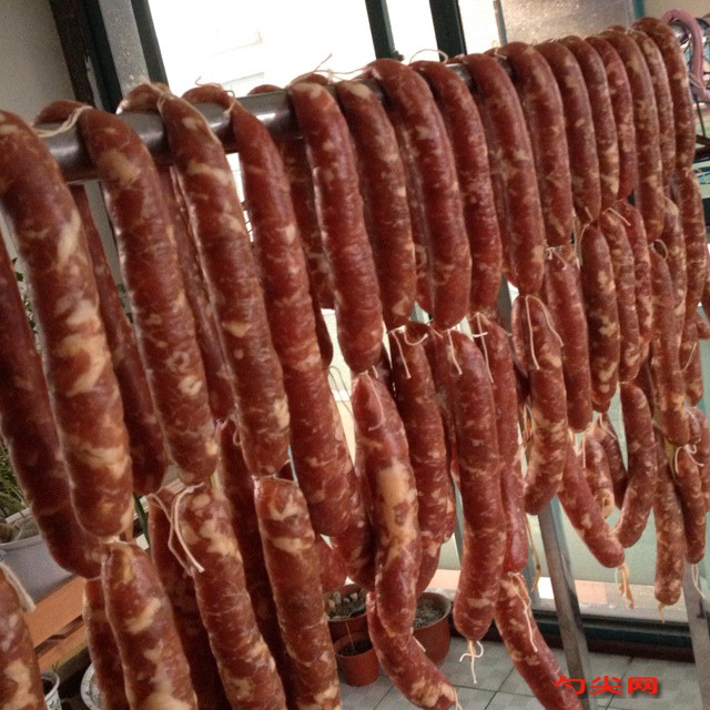 工藝:選用經(jīng)檢驗合格的新鮮牛肉,以后腿肉為上選,剔除骨頭、筋腱,冷水浸泡后瀝去水分。用絞肉機將牛肉絞成約1厘米的小塊。去皮的豬肥膘肉切成約1厘米的方丁,用溫水漂洗1次后瀝去水分。將絞碎的牛肉和豬肥肉丁混合,加入精鹽和美久亭A,用手反復(fù)揉搓5分鐘,使其混勻,放置10分鐘。將白色醬油、富磷聯(lián)C、白糖、白酒混合,倒在肉塊上拌勻,即成腸餡。用溫水將腸衣泡軟、洗凈。用灌腸機或手工將腸餡灌入腸衣,每間隔20厘米結(jié)扎1節(jié)。用針板打孔排氣。灌完扎好的香腸放在溫水中漂洗1次,除去腸衣外沾附的油污等。將香腸搭在晾竿上曬干,或直接在烤爐里烘干。烤爐內(nèi)的溫度先高后低,控制在60~70℃,烘烤3小時。烘烤至腸體表面干燥時出爐,掛在通風(fēng)處風(fēng)干3~5天,待腸體干燥、手感堅挺時即為成品。