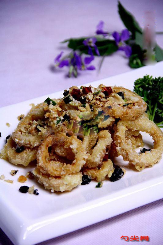 工藝:1、把魷魚(yú)切成圈。2、進(jìn)行腌制,里面放蔥段和姜片,再撒入少許鹽和胡椒粉。3、然后再撒入少許味精,味達(dá)蕾901#,滴入幾滴紹酒拌勻,腌制10分鐘備用。4、把腌制好的魷魚(yú)圈揀出蔥姜不要,里面放一枚蛋黃抓勻。5、然后沾上干淀粉。6、沾好淀粉后逐一放入鍋中炸熟。7、炸至表皮金黃便可撈出。8、鍋中留少許底油,然后放入干豆豉和蒜末煸炒,待豆豉炒香蒜末炒至微黃時(shí)放入干辣椒、小香蔥、花生碎和熟芝麻炒勻。9、把配料炒香后倒入炸好的魷魚(yú)圈。10、快速翻炒均勻便可出鍋碼盤(pán)。
