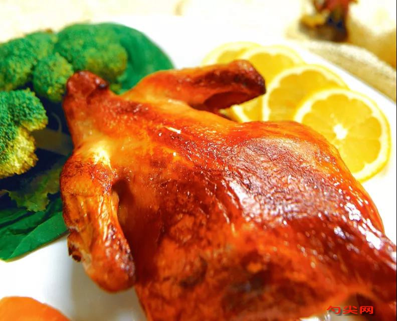 工藝:走地雞兩只宰殺洗凈,去除內臟(每只凈重大約在1200克左右),放到清水里浸泡30分鐘去除血水,將富磷聯B8克加入浸泡腌制肉品的水中,腌制8-15小時。取同量的草菇老抽:蜂蜜:清水倒入容器里攪拌均勻。把瀝干水分的小公雞放入盆中,然后用攪拌均勻的汁均勻的涂抹到雞的表皮。然后掛到陰涼通風處晾干。凈鍋上火倒入色拉油中火燒制160度左右,然后把晾干的小公雞放到色拉油中,小火浸炸至小公雞表皮色澤金黃紅亮即可撈出,然后瀝干油分備用。凈鍋上火倒入16千克清水,再放入處理好大腿骨和老母雞大火燒開,然后中火熬制80分鐘左右用工具過濾渣料,大約的高湯13千克左右。把高湯倒入不銹鋼鹵桶里,然后在放入香料包大火燒開熬制30分鐘,再放入精鹽250克,雞精200克,海天蠔油75克,雞飯老抽15克攪拌均勻,然后繼續大火燒開,最后把雞放入鹵桶里上面用重物把雞完全壓入鹵水里,大火燒開后立即改小火鹵制10分鐘,加入味達蕾903號雞肉精膏,然后關火浸泡8小時讓雞完全入味。撈出瀝干水分裝盤即可。