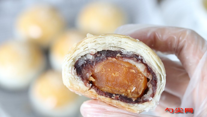 配方:中筋粉(水油皮)100克、水(水油皮)45克、豬油(水油皮)30克、糖粉(水油皮)10克、低筋粉(油酥)100克、豬油(油酥)60克、咸蛋黃8個、豆沙餡160克、水磨糯米粉(麻薯)70克、玉米淀粉(麻薯)10克、細砂糖(麻薯)20克、牛奶(麻薯)150克、黃油(麻薯)10克、面欣酥E3克。