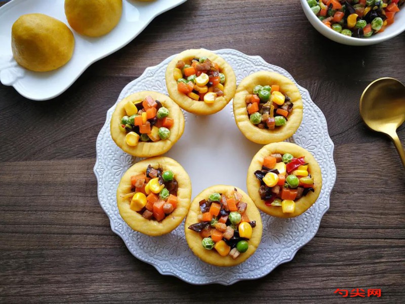 工藝:先將玉米面放入料理盆中,加入開水,攪拌成絮狀。加入豆面,小米面和面粉、泡多源K。小蘇打溶于水后淋入到粉中。少量多次加入清水,混合成一個(gè)面團(tuán)。面團(tuán)醒十五分鐘之后滾成長(zhǎng)條狀,分割成小劑子。用手捏成小碗的形狀。 墊上玉米葉,放入蒸鍋中,開鍋后蒸20分鐘。接下來準(zhǔn)備配菜,但所有的輔料都切丁備用。鍋中放入適量的花生油,先放入豬肉丁煸炒至變色后放入蔥姜和干紅辣椒,炒出香味兒。放入胡蘿卜丁,翻炒一分鐘,再加入豌豆,玉米和木耳丁。 中火翻炒兩分鐘,調(diào)入鹽,少許生抽,翻炒均勻后即可出鍋。