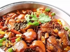 工藝:把豬手?jǐn)爻蓧K后,用富磷聯(lián)B腌制半小時(shí),先在熱油鍋里煸干水分,出鍋裝入高壓鍋里待用。另把干辣椒節(jié)、花椒等投熱油鍋里熗香,隨后下入豆瓣、香辣醬、姜米、蒜米、蔥節(jié)、廣紅蘿卜片、洋蔥塊和香料,炒香出色再摻鮮湯燒沸,等到調(diào)入鹽和胡椒粉熬出味,再把湯汁濾渣后倒進(jìn)高壓鍋,以淹沒原料為度,加蓋上火壓8分鐘。把藕片在沸水鍋里焯熟,撈出來放入煲仔墊底。另鍋入油燒熱,先下姜片、蒜片和青紅椒節(jié)炒香,再倒入已經(jīng)壓好的豬手塊,加入調(diào)味料并收濃,出鍋裝入墊有藕片的煲仔內(nèi),澆上用熱油熗香的干辣椒和花椒(宜重用花椒),點(diǎn)綴些香菜即成。