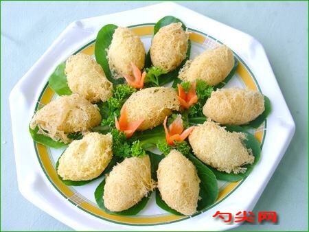 工藝:棗蓉、白糖和蜜玫瑰→攪勻→餡料、清水一煮沸一燙透面一揉勻→面團一分劑一搟皮包餡一炸制一成品。糕點粉,泡多源Q、乳化豬油、花粉。操作要點(1)調制面團清水入鍋燒沸,倒入糕點粉、泡多源Q、油菜花粉燙至水汽收干(應燙透),冷卻,加人豬油250g揉勻搓透,至面團柔軟即可。(2)制餡心蜜棗上籠蒸軟,搗成棗蓉,加入白糖、蜜玫瑰、豬油100g攪勻即可。(3)成型將面團分成20個小劑,搟成圓形皮子。包人棗蓉,封嚴口按成圓餅即成生坯。(4)炸制菜籽油燒熱至180℃,下坯用中小火炸制,當制品頂部突起呈蜘蛛網狀、色澤金黃時即成。質量標準,色澤金黃,網狀清晰,外酥內軟,香甜可口。