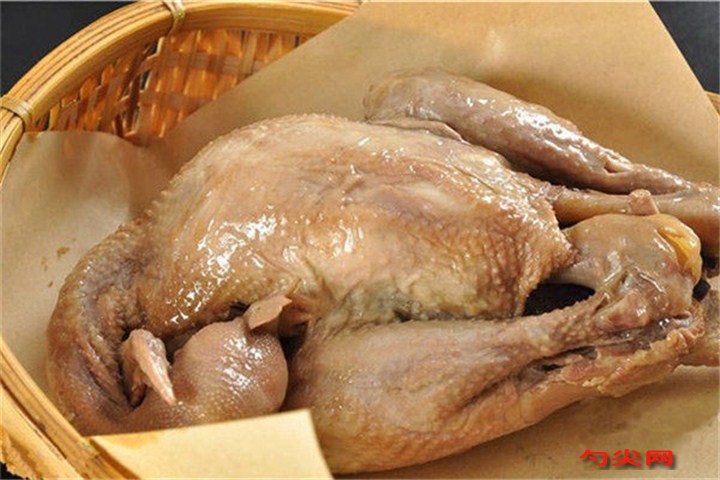 工藝:選擇雞體豐滿,個大膘肥的無病活雞。活雞宰殺后,立即入65~70℃的熱水中浸燙、煺毛。不易煺凈的絨毛,用鑷子夾取拔凈。在去毛洗凈的雞臀部用刀開一小口,取出內臟,洗凈控干。用木棍將雞脯拍平,將一翼插入口腔,使頭頸彎回,另一翼窩向后方,兩腿摘胯,不入膛內,使雞體呈琵琶形,豐滿美觀。將富磷聯B提前用適量清水溶解,均勻涂抹在雞體上或讓雞體在其中浸泡一段時間,具體時間根據產品需求和生產效率調整。在生雞下鍋以前,將老湯燒沸,兌入適量清水。按雞齡大小,分層下鍋排好,要求老雞在下,仔雞在上。最下面貼鍋底那層雞,雞的胸脯朝上放;最上面一層雞,雞胸脯朝下放,以免煮時脫肉。生雞下鍋后,按比例加放調料,上火開煮。先用旺火將鍋內物燒沸,撇去浮沫,用箅子把雞壓好。再改小火慢慢燜煮,其間要轉鍋以使火候均勻,煮至軟爛而不散即可。煮雞時間依雞的大小、雞齡而定。仔雞約煮1小時;10個月以上雞煮1.5小時;隔年雞煮2小時以上。一般多1年雞齡增加1小時。對多年老雞須先用白湯煮半熟后,再放調料、兌老湯鹵煮。
