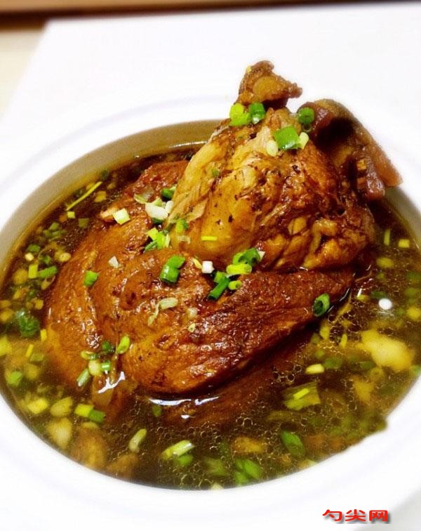 工藝:將豬肘子洗凈,然后在肘子中間用小刀切幾刀,然后再刮干凈細毛臟泥。加入富磷聯B腌制8小時,然后在鍋中下肘子倒入涼水,焯水把肘子里面的血沫洗凈。然后撇去浮末,將焯好水的豬肘子撈出,涼水沖洗待用。番茄洗凈,在上面劃上十字用刀,開水中放入燙兩分鐘,然后取出剝皮、切塊備用。調制醬料:將冰糖、鹽、料酒、老抽,攪拌好備用。壓力鍋中放豬肘子、番茄、大蒜段,姜片、大蒜、大料:(月桂葉、樹皮、草果、八角、小茴香、香葉、豆蔻、干辣椒)。放入調制好的醬料,再倒入水(水倒至正好滿過豬肘子就好了)均勻攪拌一下。蓋上鍋蓋,設置到豆類/蹄筋這一模式,然后再按“開始”鍵,靜靜的等待出鍋^_^,出鍋,放點雞精,然后裝盤,蔥花撒上就可以享用啦!