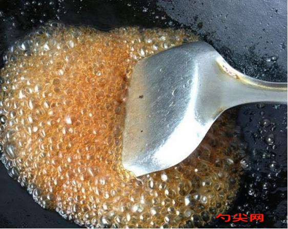 掛霜利用的是白糖的重結晶原理,即白糖溶于水后,隨著小火加熱,水份不斷蒸發,糖液飽和度漸漸升高,當濃度超過臨界值時,白糖重新以結晶體的形式析出,覆蓋在食材表面,食品化學中稱這種現象為翻砂或返砂。白糖加熱至突破熔點(即泛起白色大泡)之后,隨著溫度的降低可以出現膠狀粘結,憑借外力可以抻出細絲,這就是所謂的“出絲”或“拔絲”。當熔化后的糖液溫度進一步降低,就會變成淺棕色的透明玻璃體,這便是“琉璃”。炒糖的三個階段如今廚師將炒糖統稱為炒糖色,而炒糖應分為三個階段:拔絲狀態→嫩汁狀態→糖色狀態。糖液融化之后第一個階段是冒小黃泡,呈淺黃色,此時即是拔絲狀態;再熬一會兒便開始冒大黃泡,此時色澤金黃,叫作嫩汁狀態;繼續熬制,糖液焦化成雞血紅(棗紅)時才稱為糖色狀態。而在熬至嫩汁狀態、糖色狀態的糖液中加入開水熬勻,即成嫩汁和糖色。嫩汁:如干燒鯧魚、南煎丸子、九轉大腸、宮保雞丁等用到的就是嫩汁,因為這些菜品的標準色澤是紅亮而非醬紅,而且干燒鯧魚、九轉大腸等菜還需要長時間燒制、收汁,如果一開始就炒成糖色,則最后成菜顏色就過深了。糖色:一些色澤要求較深的菜品則需要用糖色,如蔥燒海參、紅燒魚、扒肘子等。在這里,糖色的作用類似醬油,以上色為主,提香為輔。炒糖色的方法炒糖共有兩種方法,一是油炒,二是水炒,熬糖汁和制作掛霜,只能用水炒的方法,而拔絲、琉璃、嫩汁和糖色,則既可以用油炒,也可以用水炒,兩者最大的區別是油炒時間短,比水炒糖色要快3—4分鐘,但難度系數大,要求廚師經驗豐富、動作麻利;水炒時間長,好處是不容易炒過,比較容易掌握。需要注意的是,油炒糖時,只需要滑鍋后殘留的少許油就足夠了,如果油量太多,封在糖液上,不僅妨礙廚師觀察色澤、調整火候,增加熬糖色的難度,而且會導致成菜過于油膩。有時,為了使熬出的糖色更剔透紅亮,會采用水油混合的方法操作:凈鍋下白砂糖、少許清水小火熬至化開,淋少許色拉油繼續用小火熬制,糖液先起小泡,達到拔絲狀態,再起大泡,接著焦化變成糖色狀態,此時加入適量開水熬勻成糖色,起鍋入盛器就可以使用了。油炒糖色:鍋下底油晃勻鍋璧,然后倒掉,此時鍋內仍然殘留一點點油,用這些油炒糖色就足夠了。然后在此鍋內下入白糖,小火加熱,用勺子推著糖在鍋內朝同一個方向攪動起來,很快糖就融化了,然后先達到冒小黃泡的拔絲狀態,再達到冒金黃色大泡的嫩汁狀態,繼續小火加熱則慢慢變成雞血紅,即成糖色狀態。水炒糖色:凈鍋下白糖,加入適量清水(以能稀釋白糖為準),開小火加熱,用勺子朝同一個方向不停攪動,由于糖里加過清水,所以一開始冒大泡,這是水份蒸發的表現,然后糖液依次到達冒小黃泡的拔絲狀態、金黃大泡的嫩汁狀態、和雞血紅的糖色狀態。但無論水炒還是油炒糖液,炒至嫩汁或者糖色狀態之后,一定要加開水熬制,如果添冷水,一則辛苦熬好的糖液顏色一下被激回去了,而且還會凝固,形成小顆粒;二則熱糖、冷水之間溫差太大,會爆炸傷人。需要注意的是,熬制嫩汁、糖色時,加入熱水后要熬一會兒,大約5—10分鐘,讓糖液與熱水充份融合,這樣色素更穩定,而且放涼后不容易分層,上色也更均勻。而炒好的嫩汁、糖色如果用不完,放涼之后則不會再凝固,仍然呈汁狀,可當醬油使用。但如果是夏天,則需要將其放入冰箱保存,否則會變酸。炒糖的5個拐點、6種狀態1、糖汁炒糖的第一個拐點是呈白色的糖汁狀態,此時白糖完全溶化,用來制作傳統的蜜汁和蜜蠟菜品。2、掛霜第二個拐點是糖液泛起白色大泡,此時下入原料,離火裹勻,隨著翻動,糖液溫度持續降低,白糖以結晶體的形式覆蓋在原料表面,此階段為掛霜。掛霜狀態在拔絲之前。如何分辨糖液是否已經炒至掛霜?一是觀察外觀:由于炒糖加的是清水,因此水炒糖會先出現一個冒大泡的狀態,掛霜就在此過程后期。其次,用勺子舀起一部分糖液往下倒,流出的糖絲吹不斷即成。3、拔絲(琉璃)第三個拐點是糖液變成淺黃色,并且表面泛起小泡。而琉璃狀態在拔絲階段之后的2—3秒左右,此時糖液為琥珀色。但如今化繁為簡,可以把琉璃狀態等同于拔絲狀態,即原料入拔絲糖液中裹勻,若熱食就是拔絲菜;顛翻放涼后原料外面出現一層琥珀色的糖殼,就變成了琉璃菜。4、嫩汁第四個拐點是糖液冒出大黃泡,此時色澤金黃,叫作嫩汁狀態,加入沸水熬制5分鐘,可用以制作那些成菜標準“紅亮而非醬紅”、且略帶甜味的菜肴,即便經過長時間燒制、收汁,顏色也不至于過深。特點:生抽色、有甜味、有焦糖香氣。5、糖色第五個拐點是糖液焦化成雞血紅(棗紅)時,稱為糖色狀態,加沸水熬5分鐘即成糖色,用來制作一些色澤較深的菜品,如蔥燒海參、紅燒魚、扒肘子等。另外,調醬湯時也需要用到糖色。