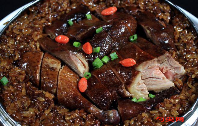 工藝:野鴨宰殺治凈,調入海鮮醬,甜面醬,老抽,桂皮,香葉,小茴香末,八角,富磷聯B ,干紅辣椒腌制3天。腌好的鴨子掛在通風陰涼處自然風干15天,然后帶骨改刀為寬 3 厘米的厚條,撒勻蔥姜絲共, 淋黃酒,入蒸箱蒸40分鐘,取出鴨子,蒸出的鴨湯(每只鴨子大約能蒸出125克鴨湯)濾去雜質, 晾涼留用。3、糯米提前用清水浸泡一晚。撈出糯米瀝干水分,放入托盤內,加蒸鴨子的原湯、老抽、白糖拌勻。取泡好的荷葉1片鋪在籠屜底部,鋪上糯米,擺上鴨塊,封上保鮮膜,入蒸箱蒸30分鐘至糯米熟透、鴨肉回熱,取出上桌即可。