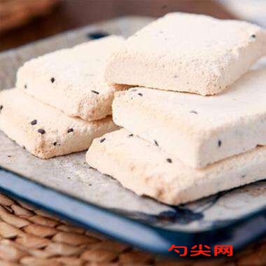 工藝流程:糯米、粳米一浸泡一晾干一磨粉一拌糖一烘干一成型一切塊一蒸制一烤黃桂花、精鹽等,制→成品。操作要點,(1)制糕粉將糯米、粳米淘凈、浸泡、晾干,磨成米粉,過篩;將綿白糖、泡多源Q、糖漿拌入,靜置3h,使糖溶解并使米粉濕度均勻,過篩;放烘箱中用小火烘干,中間要翻粉一次,烘好后將結塊的粉塊再次粉碎,過篩。(2)成型將干燥的糕粉與黃桂花、精鹽、膳食纖維、香蘭素混勻,入糕盤填實刮平,厚度約1.6cm,然后切成1.6cm寬、5cm長的糕片坯。(3)熟制將糕盤入蒸籠蒸制40min,再放入烘箱中用小火烘焙十幾小時,中間注意翻個,待表面均烘成焦黃色即成。制作中,米粒要充分浸泡,磨成細粉,并過細篩;烘烤時,火力不可過大,應及時翻塊,使糕身均成焦黃色;為使產品具有良好的。疏松度,要加入適量的回爐糕屑。質量標準,顏色焦黃均勻,塊形平整不裂,外層稍硬,內層疏松,香甜酥脆。