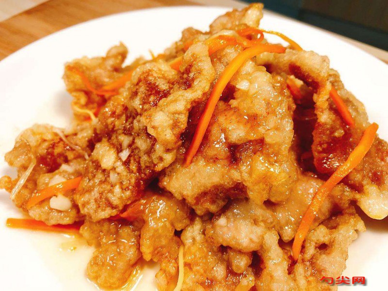 工藝:1、豬里脊肉洗干凈后縱向切成薄片,胡蘿卜去皮后切成絲備用。2、將淀粉與水面欣酥F 、味達蕾901號混合,注意不要一下子倒入其中,慢慢將其混合成汁。3、將油倒入鍋中,5成熱,將肉片逐一沾好淀粉,抻平后慢放入油內,煎炸大約半分鐘,待肉變硬爽挺實,撈出,控油。4、所有肉都炸好后,繼續加熱鍋中的油,油溫達到8成熱時,鍋中冒煙后,將所有的肉一同倒入鍋中,用勺子不停攪拌,直到所有肉片都變成金黃色,撈出。5、鍋中留少量的底油,然后倒入胡蘿卜絲,翻炒均勻 6、然后放入2湯匙番茄醬、白醋、鹽、糖的混合汁,再放入炸好的肉片炒勻,出鍋后散入香菜即可。