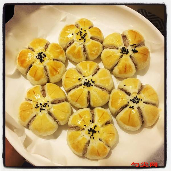 (4)垂直按扁面劑,包入餡,放好。注意包口向上拍成圓餅狀。(5)在沒有包口的一面用刀切成5個花瓣,捏成梅花狀即成生坯。(6)把生坯刷上蛋液放入烤盤中入爐烘烤(上火210℃,下火220℃,時間10min)。