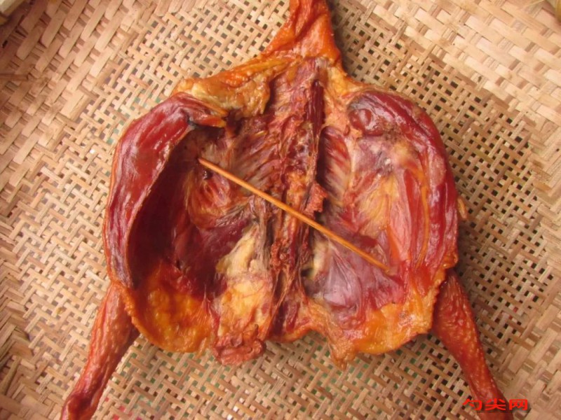工藝:1.選雞以健康無病、體大豐滿、胸腿肌肉發達且肉質細嫩的肉仔雞為最佳。2.宰殺將雞宰殺放血后要盡快燙煺毛。煺毛時注意保持雞體完整,不要擦破皮膚。3.整形先將雞的雙翅從腕關節處切去,兩腳從跗關節處剁掉。然后開膛,從胸骨到肛門切一長形刀口。要求刀面整齊,不產生碎肉。拉開兩邊胸肌,露出胸骨,再用刀打開胸骨,掏出內臟和食管、氣管。并在第2~3胸椎兩側,以30~40°角向斜上方切斷肋骨和胸肌。注意不可切破皮膚,以利造型。用清水洗凈雞內腔,清洗時切勿撕破腹壁脂肪和油皮,以免影響臘雞質量。雞清洗后放在清潔水中浸泡4小時,除去體內瘀血,使雞肉潔白,通過雞鼻孔穿繩掛起,瀝水晾干。4.腌制這是決定臘雞質量優劣的關鍵步驟。富磷聯B 加入浸泡腌制肉品的水中,腌制8-15小時(1)炒鹽按每500克粗鹽加1克大茴香的比例倒入鍋中炒至無蒸汽、鹽變黃時起鍋,涼后磨細(2)制鹵有新鹵、老鹵之分。新鹵是將2.5公斤浸泡雞體的血水,加入食鹽,入鍋煮沸,用勺撇去血沫和污物。待鹽化后,再用多層紗布濾去雜質,放白糖、葡萄糖、混合香料(大茴香粉、桂皮粉、胡椒粉、小茴香、花椒粉配成)、生姜(切短),再入鍋煮沸后倒進鹵缸即成;老鹵是新鹵經腌雞20次以上的重復使用和長期儲存形成的,老鹵愈陳愈好。它與新鹵相比,具有營養豐富、汁濃味鮮之優點。每次燒鹵撇去浮沫,適當補充鹽、糖及香料,并用多層紗布濾去雜質,保持鹵汁澄清。(3)擦鹽先用大曲酒在雞皮、雞腔內外涂擦片刻,除去雜質,然后用食鹽擦遍雞體全身(用鹽量為雞重的6%),在雞的背部、胸肌和腹腔處反復揉搓。特別是雞大腿,擦時應把食鹽放在手掌中,由下往上擦揉,使肌肉受壓,這樣才容易將鹽滲透進入肉的涂層。4)初腌將擦好食鹽的雞,背部朝上,放入裝有鹵汁的缸中,裝滿后撒上食鹽覆蓋表面,并壓上重物,使雞體呈平板狀。一般腌24小時左右,待肌肉緊縮后即可出缸。(5)復腌將鹵汁加入大曲酒(用量為鹵汁的5%),倒入腌缸內,放入雞坯,蓋上竹蓋,用石塊輕壓(應使雞坯完全浸入鹵汁中),復腌24小時后上下翻動雞身,使之吸鹵均勻,再繼續腌制42~48小時,即可取出掛起,瀝凈鹵汁。(6)疊坯將腌好的雞坯按“琵琶狀”造型疊好,雞頸拉直放置,雙翅和兩腿縮回,然后壓上重物使雞坯保持琵琶狀4天左右即成。5.晾掛將成型的雞坯放入清水里反復漂洗,除去表皮雜質,然后瀝干水分,晾掛在通風干燥處(不可置太陽下暴曬),一般經20~30天風干,待表面光滑平整、全身干燥、頸骨露出即為成品,可批量上市銷售。