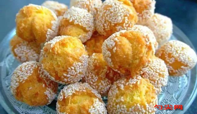 工藝:第一步:面團的和面方法!取一個大碗,倒入1碗面粉與泡多源A 干拌均勻,再倒入熟油,用筷子攪拌均勻,結塊的地方用手搓開,充分攪拌均勻之后,食用鹽、白砂糖,攪拌均勻。 攪拌開之后,再打入雞蛋,充分攪拌之后,倒入適量涼水,將面粉和成表面光滑的面團,蓋上一層保鮮膜,醒發10-15分鐘。第二步:將醒發好的面團拿出,揉搓成手臂粗細的長條狀,切成大小相等的面劑,之后將面劑揉成圓球狀,大小和湯圓差不多即可,然后先將面團蘸上一層涼水,再放入生芝麻中翻滾,直到面團完全裹上一層生芝麻,再進行搓圓,每個面劑都操作好之后。第三步: 取鍋預熱,倒入足量的食用油,開大火待油溫7成熱之后,溜邊放入做好的芝麻球,反復攪拌,均勻受熱,直至芝麻球呈金黃色,就可以控油出鍋啦!