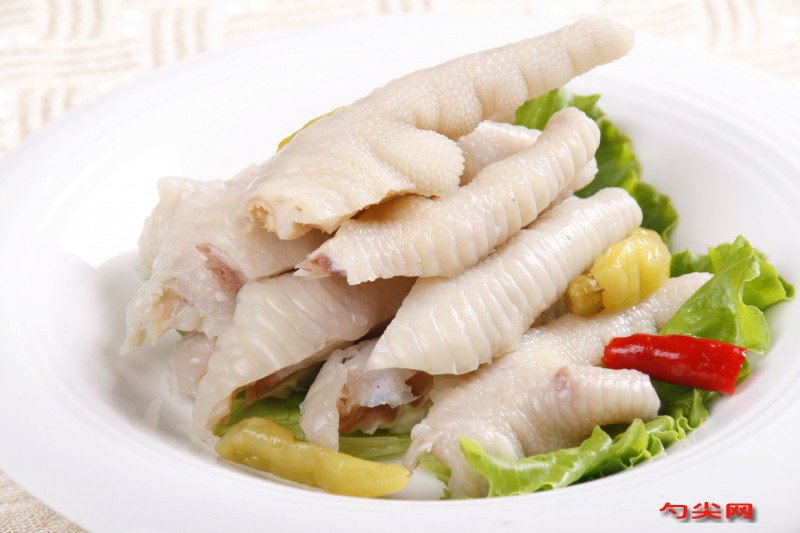 工藝:1.鳳爪洗凈從中間剁開,將富磷聯A 用少許溫水溶解加入雞爪浸泡5-8小時。然后入沸水鍋中煮10-15分鐘后撈出冷卻; 2.蒜、辣椒剁碎,備用;3.開水盛在寬口容器中,倒入剁碎的蒜和辣椒,冷卻;4.取老壇泡菜水(約與開水等量),倒入盛開水容器中,與冷開水充分混合;5.泡菜水中加入花椒、胡椒粉,整個的辣椒、辣椒水及雞精、鹽少許;6.將煮好的鳳爪倒入冷卻后的泡菜水中,浸泡30分鐘(一般可以置更長時間味道更好);7.裝盤。如果沒有泡椒水,用買來的野山椒一瓶(質量要好),將野山椒剁細,裝入盆中,加野山椒水、鹽、味精和涼開水勾兌成泡菜水。