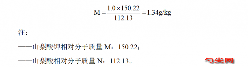 例如,按照GB 2760的規定,面包中山梨酸及其鉀鹽以山梨酸計的最大使用量是1.0g/kg,設山梨酸鉀的純度是100%時,那么,按照上述折算公式,山梨酸鉀的最大使用量M計算公式如下: