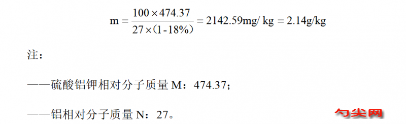使用硫酸鋁鉀、硫酸鋁銨后,需要確定食品(干樣品)中鋁的殘留量不超過100mg/kg。可以按照《食品安全國家標準 食品中鋁的測定》(GB 5009.182-2017)中規定的檢測方法進行檢測,所得結果即是干樣品中的鋁殘留。食品中硫酸鋁鉀的允許使用量,可以按照使用的硫酸鋁鉀中的鋁含量進行粗略折算,即:
