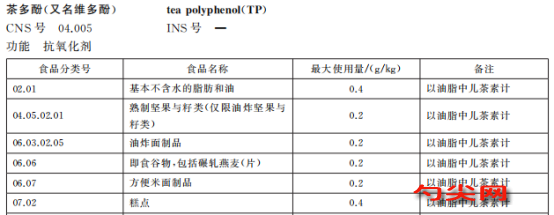 茶多酚的最大使用量是以油脂中兒茶素計的,一般檢測食品中茶多酚含量可以按照《茶制品 第2部分:茶多酚》(GB/T 31740.2-2015)中的方法進行。但在我們研發初期采用茶多酚為抗氧化劑的時候,也可以通過粗略計算暫定茶多酚的使用量,之后再進行反復試驗結合試驗效果以及標準要求,確定合適的使用量。