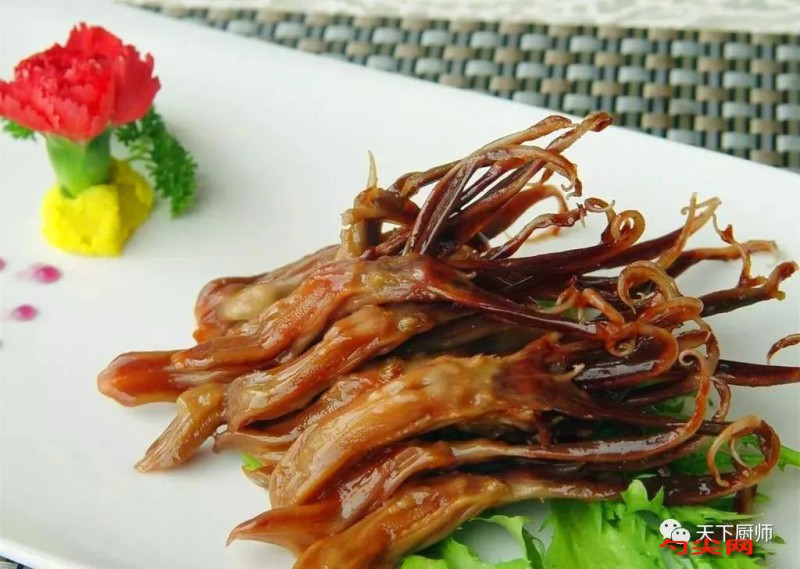 工藝:1、鴨舌洗凈,加入蔥、姜、料酒碼去腥味。2、將腌好的鴨舌入熱水( 水中加蔥姜 )焯一下撈出,去除血水和腥味。3、鹵水燒開,放入仔姜、鹽、雞精各適量以及袋裝保鮮青花椒100克、干辣椒60克、干紅花椒50克、干青花椒50克,再次下入香料包,倒入鴨舌,鹵約3分鐘即可關火,再浸泡2分鐘后撈出走菜。