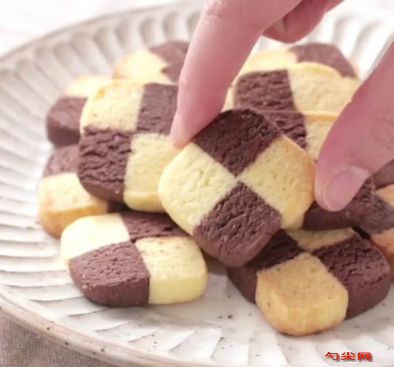 配方:原味面團:無鹽黃油60克、細砂德30克、雞蛋30克、低筋面粉120克、面欣酥F0.24克。巧克力面團:無鹽黃油60克、細砂糖30克、雞蛋30克、可可粉30克、低筋面粉90克、朗姆酒4ml、面欣酥F0.18克