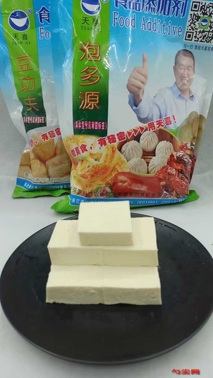 工藝:1.首先稱取大豆500克,將大豆洗凈,在春秋季水溫10℃—20℃時,浸泡12-18小時以上,夏季水溫30℃左右;浸泡6小時—8小時(每24小時換水);冬季水溫5℃,浸泡約24小時。水質以純水、軟水為佳。用水量一般以豆水重量比1:3為好,浸泡好的大豆約為原料干豆重量的2.2-3倍。泡好的豆要求豆瓣飽滿,裂開一小線。但浸泡時間如果過長,會影響出漿率。2.開始磨漿:一般選用能進行漿渣自動分離的磨漿機,粗磨、細磨共2次-3次,盡可能提高大豆蛋白的抽提率,水與干豆的比例是8-9:1。第一次粗磨時加水量為總加水量的30%,第二次調節磨漿機螺旋進行細磨,加水量為30%,第三次的加水量為40%,盡可能地把豆渣里面的漿沖洗出來。磨好的渣應手感細膩無顆粒。3.把磨好的漿放在不銹鋼制的煮漿鍋里,大火將漿煮至90-95℃(溫度過高影響豆腐泡膨松),保持3-5分鐘把漿煮透。4.把煮好的豆漿倒入點漿桶或缸中,再加入1斤左右涼水,然后降溫至75℃,再加入提前用涼水溶解好的泡多源W20克,加泡多源W可使做出來的豆腐水煮后,膨松個大,穩定。5.接下來點漿:稱取10克豆功夫A型,用少量冷開水溶解。然后點入降溫后的豆漿,(用豆功夫A點漿,做的豆腐凝固結實、潔白細嫩、不易發酸、不發苦,不破碎。)上下快速翻動豆漿至出現濃稠狀即可停止(點嫩點,煮豆腐才比較膨松),蓋好桶蓋靜止15-20分鐘既成豆腐腦。6.將凝固好的豆腐腦劃開,倒入磨具,壓實點,壓榨成豆腐。7.將做好的豆腐坯切成均等的小塊放入火鍋中煮透,看煮好的豆腐膨松個大飽滿、漂浮穩定,好吃又營養高。