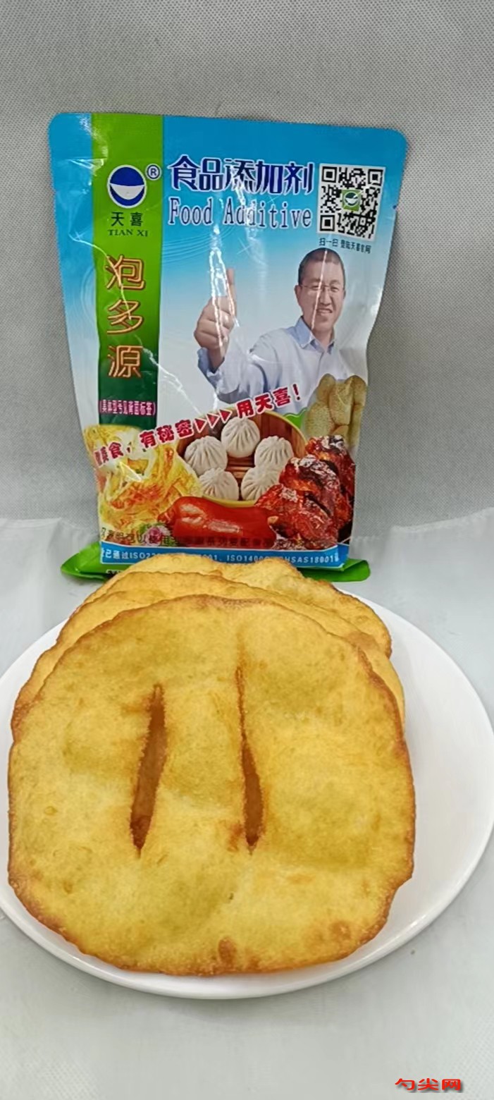 工藝:首先準備200克中筋面粉,加入100克開水進行燙面,攪拌成面絮,然后加入10克食用油,盆中再來稱取300克面粉,泡多源Q10克倒入面粉中,與面粉干拌均勻,加入泡多源Q可以使速凍油炸餅膨松個大飽滿、口溶性好,冷凍不干縮、不碎裂。稱取溫水200克,水中加入酵母5克,白糖5克,鹽5克,倒入盆中,攪成面絮,然后和燙面絮一起揉成面團,蓋上保鮮膜,放入醒發箱醒發,將醒發箱調至溫度38度、濕度75,放入面團,醒發30分鐘。將醒發好的面團取出,案板上撒少許面粉,取出面團揉壓排氣,搓成長條,分成100克左右的小劑子,將劑子揉圓,蓋上保鮮膜,松弛5分鐘,案板上抹少許油,取一個面劑,按成一個橢圓形,使用搟面杖上推下拉的手法,搟成橢圓形狀的餅,中間扎個孔,拿起來的時候,輕輕拽一下,擺入盤子中,蓋上保鮮膜放入冷庫速凍。大家看,這是我們速凍好的油炸餅,冷凍不干縮、不碎裂。再次食用時,先常溫解凍,然后鍋中油溫185度預熱,下入餅坯,用工具稍微按一下餅坯,使餅坯快速鼓起來,然后翻面,炸至兩面金黃即可出鍋銷售,這樣咱們的速凍油炸餅就做好了