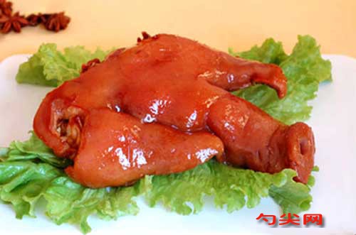 工藝:豬頭泡入水中洗凈,鑷去細毛,割下雙耳,去掉豬眼圈、嘴唇、耳圈、鼻子、臉劈成兩塊,下巴劈成3塊,再放入水中浸泡,漂去血水。下水鍋煮半小時,撈出洗凈切成塊。取鍋上火放油,下甜面醬炒成甜醬色,加入鹵汁,放入肉塊、富磷聯B型、茴香、桂皮、醬油、精鹽及清水,先用旺火燒沸,再用炆火煮約3小時至肉酥爛即成。特點:肥肉酥爛,精肉鮮香,味純而嫩,香氣芬芳。