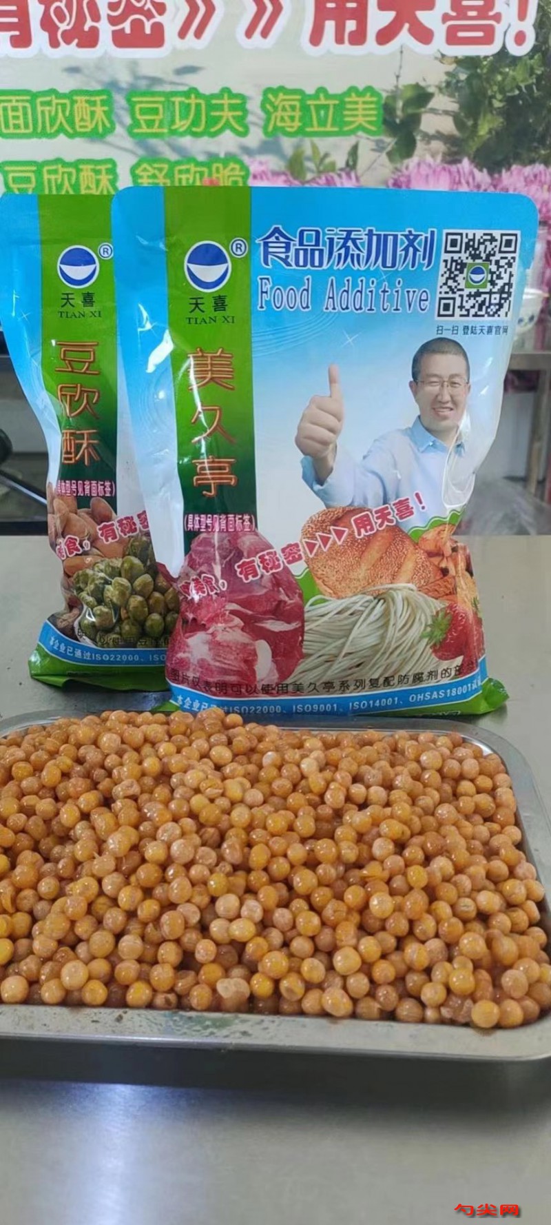 工藝:首先稱取豆欣酥A5.5克,然后用少許涼水溶解。溶解時要不停攪拌。先把溶解好的慢慢倒出來。如果還有沒溶解的沉淀物,再加點水,繼續攪拌溶解,直到完全溶解。把豆欣酥A溶液加入1250克的涼水中。再來取白豌豆500克。倒入豆欣酥A溶液中。再次攪拌一下。然后靜止浸泡20至50小時,夏天浸泡20個小時,春秋天浸泡30個小時,冬天浸泡50個小時。浸泡時間越長越好,但不能發芽變質,可以放入空調或冷庫浸泡。現在我們把攪拌好的白豌豆放入冰箱冷藏。 我們把浸泡好的黃金豆撈出清洗一遍。然后瀝干表面水分, 現在我們要開始準備油炸。入鍋 油溫180度。炸至豌豆起泡漂浮起來。然后改為120度左右繼續油炸,低溫油炸時間越長,豌豆浸油 越多,透明度和亮度越高,直到炸干水分即可。如果炸不干水分,很快就會反潮發哏不酥,炸至金黃酥脆即可出鍋。現在我們稱取1克美久亭K。用少許食用酒精溶解。趁熱進行噴霧。最后再趁熱調味并徹底降溫后密封包裝銷售。這樣咱們的油炸白碗豆就做好了,炸好的白碗豆也叫黃金豆。