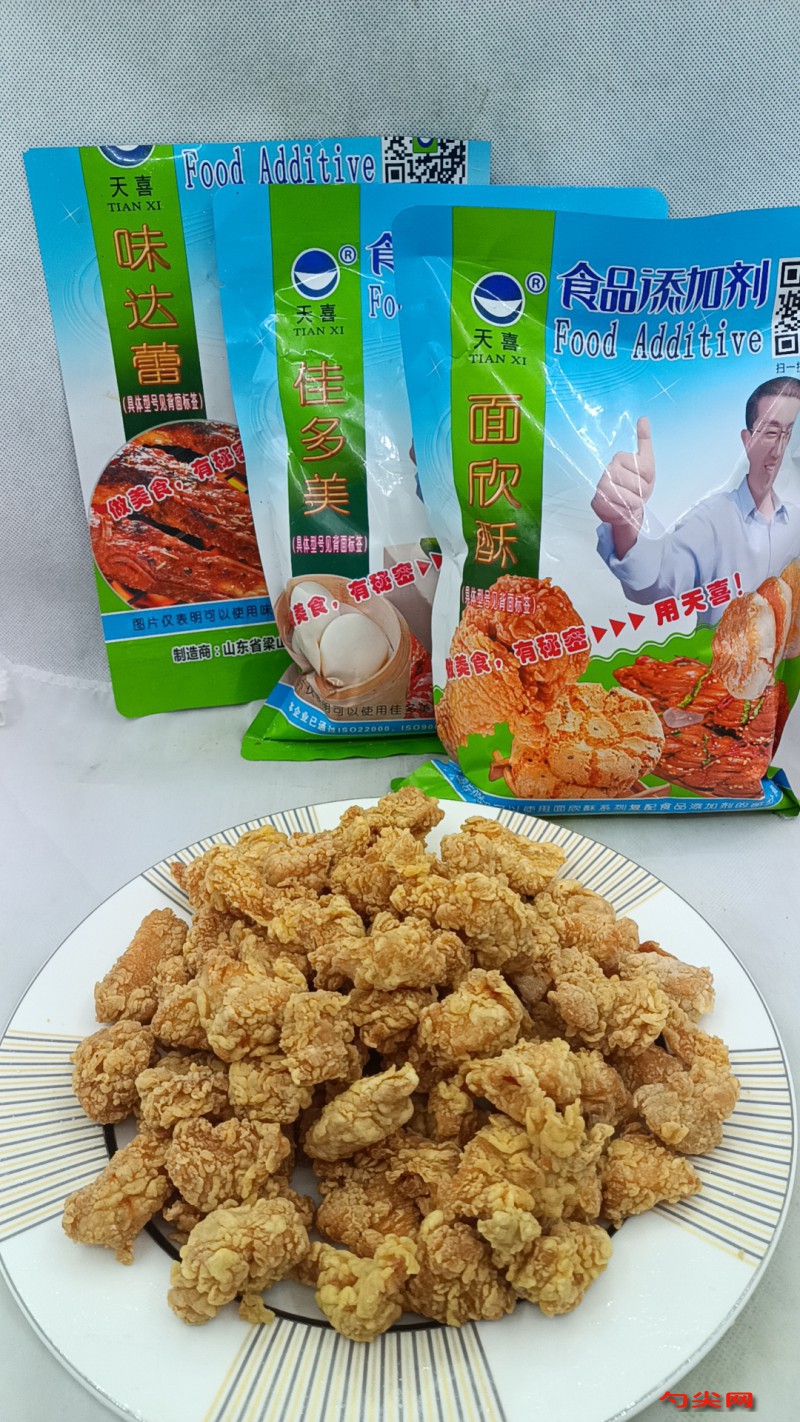 工藝:首先將500克雞胸肉沖洗一下。然后切成小塊。把肉塊放到盆里,再來稱取10克佳多美A24,這是天喜公司生產的,它屬于復配食品添加劑,加入佳多美A24可以使雞排起到保水、嫩肉、膨松的作用。使用少許溫水溶解后加入,抓拌均勻,浸泡肉塊5-8小時。浸泡過程中抓揉幾次。將浸泡好的肉塊瀝干水分,加料酒、生抽、鹽、胡椒粉、辣椒粉、姜片,味達蕾901號1克,這是天喜公司生產的,它屬于復配增味劑,可以讓雞米花增加鮮味,去除腥味。抓拌均勻,腌制1個小時。現在準備炸雞裹粉,低筋面粉130克、淀粉50克、面欣酥F2克,將他們混合均勻即成炸雞裹粉,將腌制好的雞塊先裹一層炸雞裹粉,過一遍清水,再裹炸雞裹粉,抖出多余鱗片,即可油炸,鍋中放油,油溫160度下入雞米花,小火炸至金黃酥脆即可出鍋。如果做冷凍雞米花(不經過油炸),還要加入美久亭N0.5克,起到防腐保鮮作用。這樣咱們的無磷雞米花就制作完成了。
