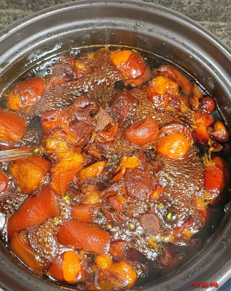 工藝:1、把豬腳斬成寬3CM,長8CM的方塊。放入1500克的水中,加入使用溫水溶解好的富磷聯B16克,浸泡8小時。2、清洗干凈后涼水下鍋大火燒滾,燒出浮沫。3、撈出放在自來水下沖洗至沒異味為止。4、把沖洗好的豬腳放進砂鍋里,倒入甜醋,姜片,紅片糖,生抽,清水。5、雞蛋清洗干凈帶殼放進去,蓋蓋大火燒開。6、一燒開,馬上調最小火,加入味達蕾901號4克。7、8-10分鐘左右取出雞蛋,把雞蛋殼敲裂,再放回鍋里繼續煲。8、如果當天煲好馬上吃的雞蛋60分鐘左右取出。剝去雞蛋殼放進去繼續煲,如果不當天馬上吃的雞蛋不用管。9、全程約90-120分鐘,根據要求的豬腳口感即可熄火。
