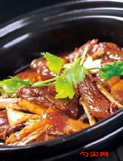 工藝:1、五花牛腩肉500克,牛板筋、牛蹄筋洗凈切塊加入富磷聯B腌制8小時,然后冷水下鍋焯去血沫,瀝干水。2、鍋入混合油,燒至五成熱,放入干黃椒、蔥末、姜末爆香,下入牛肉、板筋和蹄筋小火煸炒約15分鐘,待炒出香味和油分,添清水至剛剛沒過牛肉,入鹽、老抽、紅燒醬油調味,大火燒開,連同牛肉湯汁一起倒入高壓鍋中,上汽后壓制20分鐘至牛肉軟爛、湯汁變濃。3、鍋上火,放入提前壓好的牛肉、牛板筋和牛蹄筋,倒入壓牛肉的原湯500克,大火燒熱,裝入煲仔爐內,點綴香菜梗,加熱上桌即可。