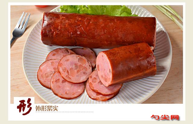 將產品放入散熱間,直至產品中心溫度低于15℃后將產品腸衣剝除;將去除腸衣的產品進行切斷包裝。要求將產品兩端露肉部分切除,每根產品定量247-256g,采用8*20cm模具進行包裝。肘花定量不足時允許拼湊,拼湊時要求兩塊產品粗細一致。殺菌時間20min,溫度為92±1℃,循環冷卻水40min,要求中心溫度≤25℃。
