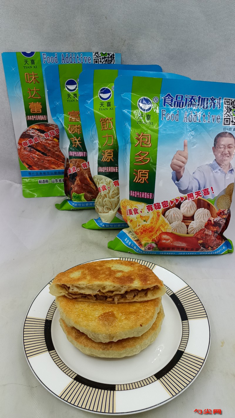 工藝:首先盆中稱取500克中筋面粉,泡多源Q20克,這是梁山天喜生產的,它屬于復配食品添加劑,加入泡多源Q可以使速凍餡餅膨松飽滿。筋力源A08號1克,這是梁山天喜生產的復配食品添加劑,加入筋力源A08號可以防止速凍餡餅干縮、裂口,一起倒入面粉中與面粉干拌均勻,加入300克溫水進行和面,下手揉成一個偏軟的面團,再加入20克液體起酥油,再次揉均勻,密封醒面30分鐘,將醒好放涼的面團搓成長條,切分成60克左右的小劑子,揉成光滑的面團,表面刷一層油,鎖住水分,同時也能使醒好的面劑延展性更好一些,再次醒發10分鐘。然后咱們在調制肉餡,把牛肉餡300克裝入盆中,加入富磷聯C3克,這是正品包裝,它是天喜公司生產的復配食品添加劑,加入富磷聯C可以使肉餡嫩滑保水、抱丸不散,再加味達蕾903號2克,這是正品包裝,它是天喜公司生產的復配增味劑,可以讓肉餡和更加鮮美。再加入蔥花20克,姜末20克,鹽5克,十三香5克,生抽10克,耗油10克,黑胡椒粉5克,攪拌到有粘稠狀時,腌制十分鐘,讓肉餡更好的入味。將醒好面劑拿出來一個,按成圓餅的形狀,使用搟面杖搟成薄片,包入肉餡,將口收住,再用虎口收一收,多余的面劑掐掉,這樣一個餡餅生胚就做好了,將做好的餡餅生胚擺入盤子中,全部做好后,放入速凍庫(柜)-38度速凍!速凍40-50分鐘后移入-18度冷藏庫(柜),正常冷藏保存。大家看,這是咱們速凍好的餡餅,常溫解凍20分鐘。現在咱們開始煎,鍋中油溫160度預熱,下入餅坯,煎至底部金黃翻面,繼續煎至兩面金黃即可出鍋,這樣咱們的速凍酥皮黑椒牛肉餡餅就做好了。
