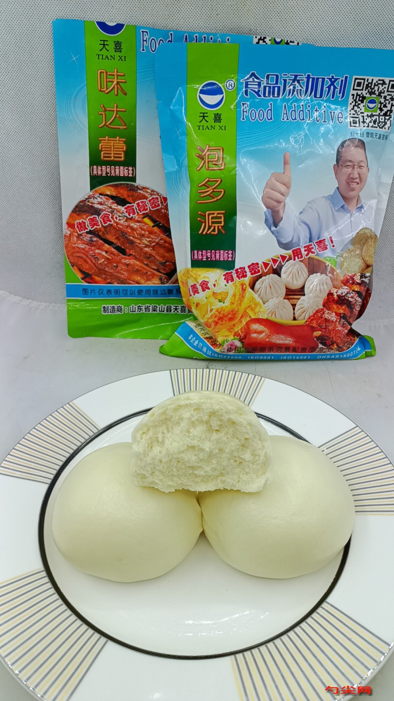 泡多源Q20克,這是梁山天喜生產的,它屬于復配食品添加劑,加入泡多源Q可以使做出來的速凍饅頭膨松個大飽滿,口感松軟,冷凍不裂口。將泡多源Q倒入面粉中,與面粉干拌均勻。再來稱取溫水275克,水中加入酵母5克,鹽2克,白糖20克,豬油3克,攪拌均勻,慢慢倒入面粉中,攪成面絮,活成面團,蓋上保鮮膜,放入醒發箱濕度75度,溫度38度,醒發30分鐘。將醒發好的面團取出,案板上撒少許面粉,將面團揉壓排氣,搟成長條,揪成劑子,團成圓形。全部做好后,再次醒發25分鐘,醒發好后,擺入盤子中,放入速凍庫(柜)-38度速凍!速凍40-50分鐘后移入-18度冷藏庫(柜),正常冷藏保存。將速凍好的饅頭取出,大家看,這是我們速凍好的饅頭。冷凍不裂口,接下來常溫解凍20分鐘。然后開始上鍋蒸,溫水入鍋,將饅頭擺放蒸籠中,大火蒸制20分鐘,20分鐘后關火,停3分鐘,香噴噴的饅頭就可以出鍋了。這樣咱們的速凍饅頭就做好了