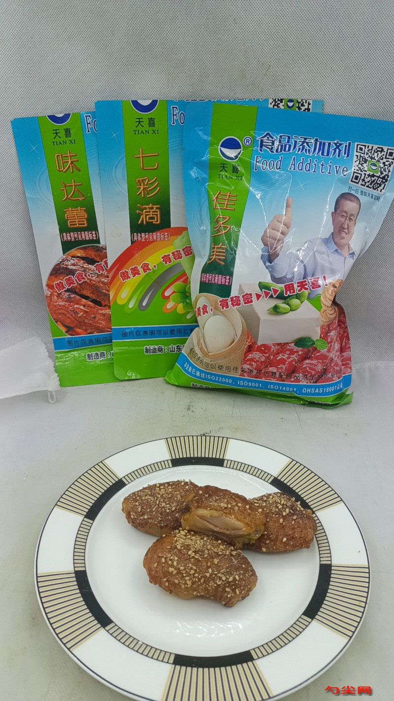 工藝;首先準備500克的雞翅中洗凈,瀝干水分,用鋼針戳幾個洞。然后把雞翅中抹上少許鹽。再稱取10克佳多美A24,這是梁山天喜生產的,它屬于復配食品添加劑,加入佳多美A24可使烤雞翅膨松飽滿,肉質細嫩。使用少許溫水溶解后,倒入盆中,然后再加入味達蕾903號2克,這是梁山天喜公司生產的,它屬于復配增味劑,加入味達蕾903號起到增加鮮味的作用,倒入盆中。抓拌均勻,腌制4小時。將腌制好的雞翅中取出,瀝干表面水分,稱取七彩滴1號2克,這是梁山天喜公司生產的,它屬于復配著色劑,加入七彩滴1號可使烤雞翅色澤黃亮,使用少許溫水溶解,倒入盆中,抓拌均勻。再加入少許料酒、生姜片、老抽、蠔油,抓拌均勻,腌制40分鐘。然后把腌制好的雞翅中擺入烤架。烤箱提前預熱180度,放入雞翅中,烤30分鐘。烤至兩面金黃即可出爐。這樣咱們的無磷烤雞翅就做好了。