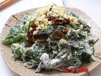 配方:新鮮萵筍葉500克,面粉100克,玉米淀粉50克,大蒜30克,食鹽8克,雞精5克,香油10毫升,味達蕾901號3克,鮮味寶5克,食用油適量,紅椒絲適量,蔥花適量。