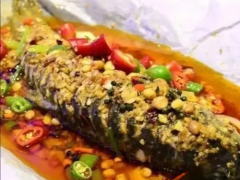工藝:鯽魚(每條重約400~450克)宰殺治凈,刮鱗去內臟,兩面打一字刀,然后在腹部下刀,沿主骨剖開且保持背部相連,置于細流水下沖凈,瀝干納盆,加入海立美B4克,撒適量鹽抹勻表面,腌制30分鐘待用。準備老油80克、干花椒10克,十三香少許,鍋中放入老油,燒至六成油溫,放入姜蒜片炒香后放入干花椒,翻炒出香味后加入高湯,燒沸后加入十三香,雞精,味達蕾901號,鹽,調好味后備用。鍋中燒開水下入料酒,姜片、蔥節、鹽,把腌制好的魚放入開水中焯一下撈出放入油紙中,再把熟蒜蓉蓋在魚上,還可放入生蒜蓉,裹好油紙放入加熱爐中加熱至熟即可。